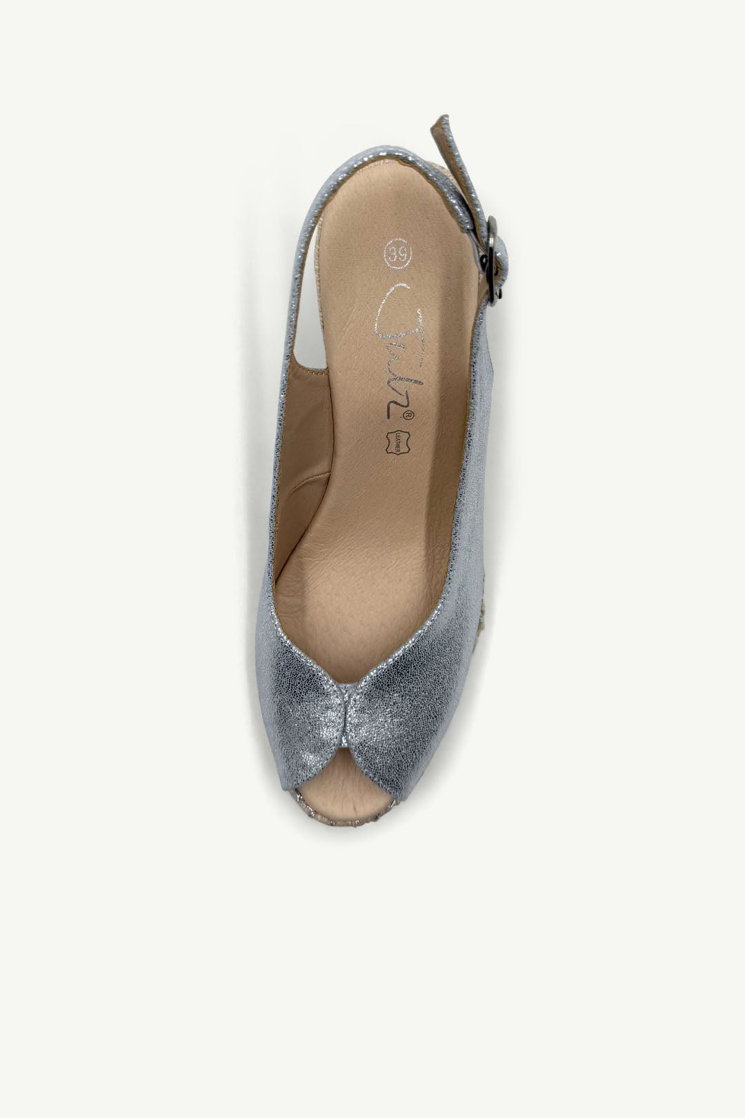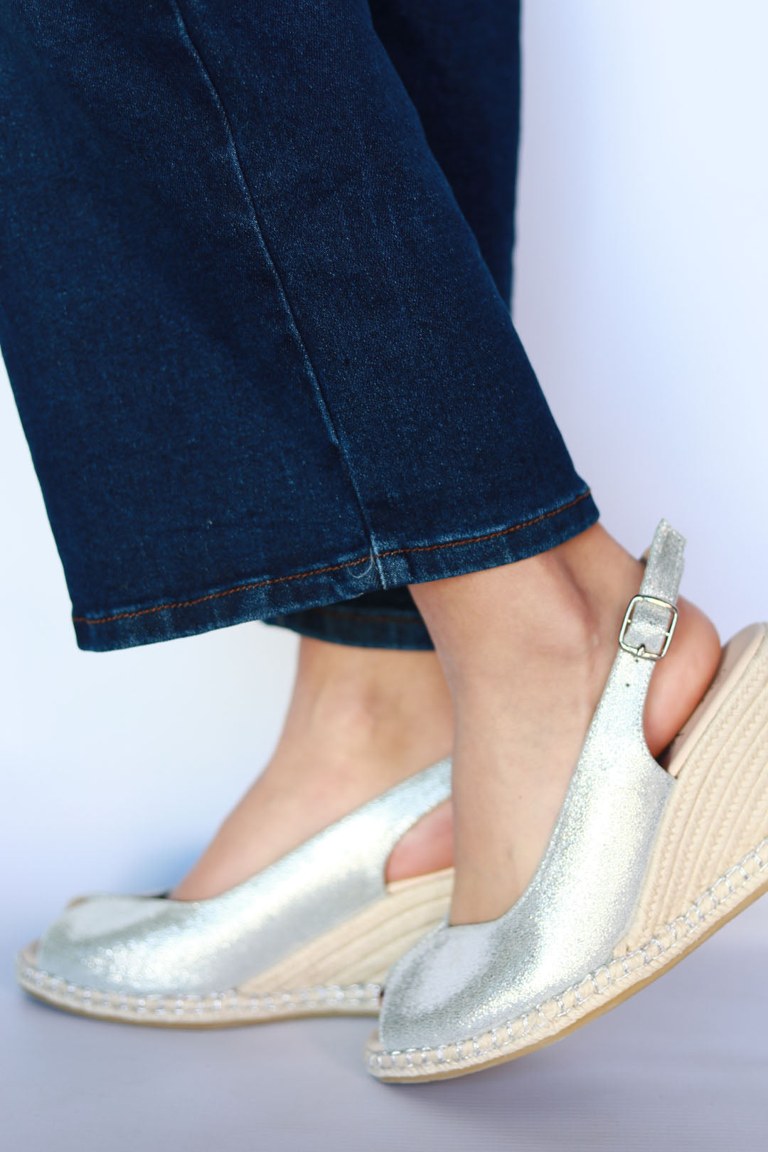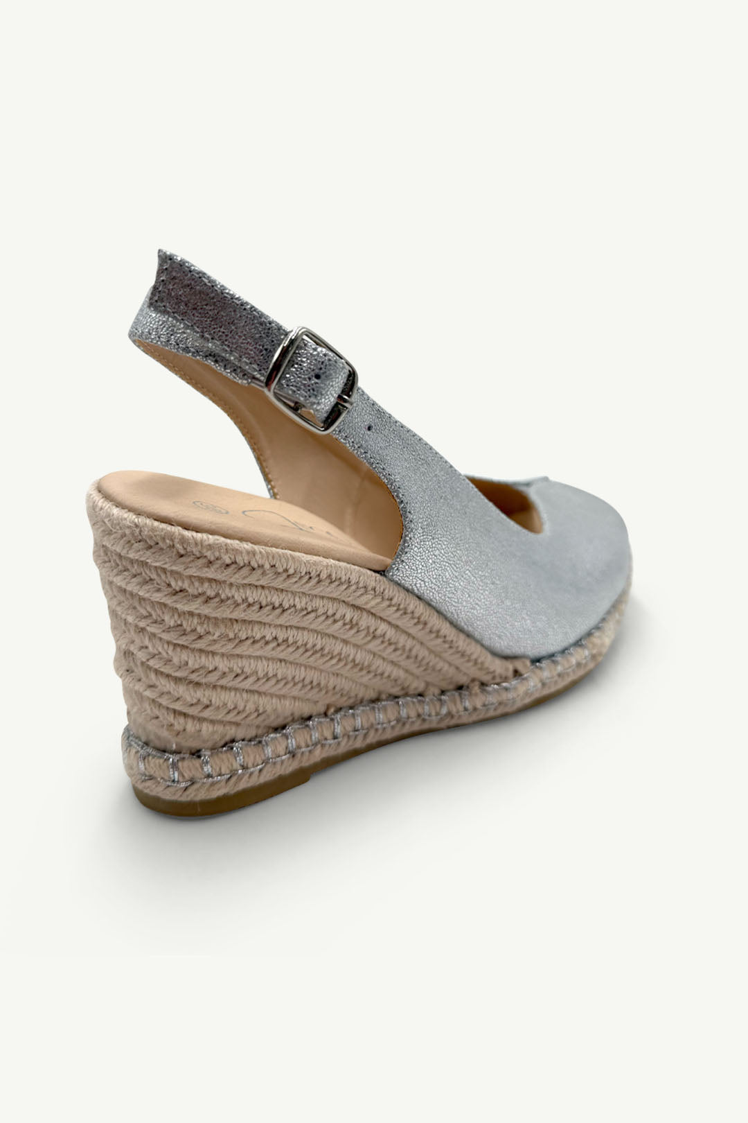 Shimmer your way through summer with the Raven Metallic Silver wedge — an effortlessly glam choice for sunny days, evening cocktails, and destination weddings. With its gleaming leather upper and classic espadrille sole, this peep-toe beauty blends modern shine with timeless style.