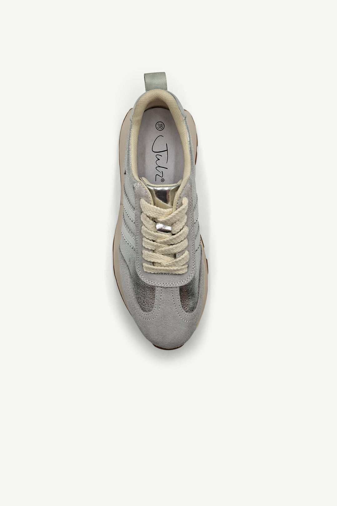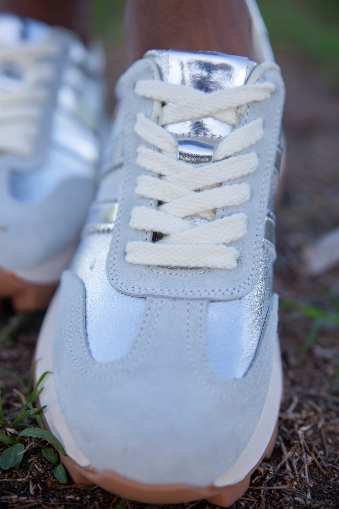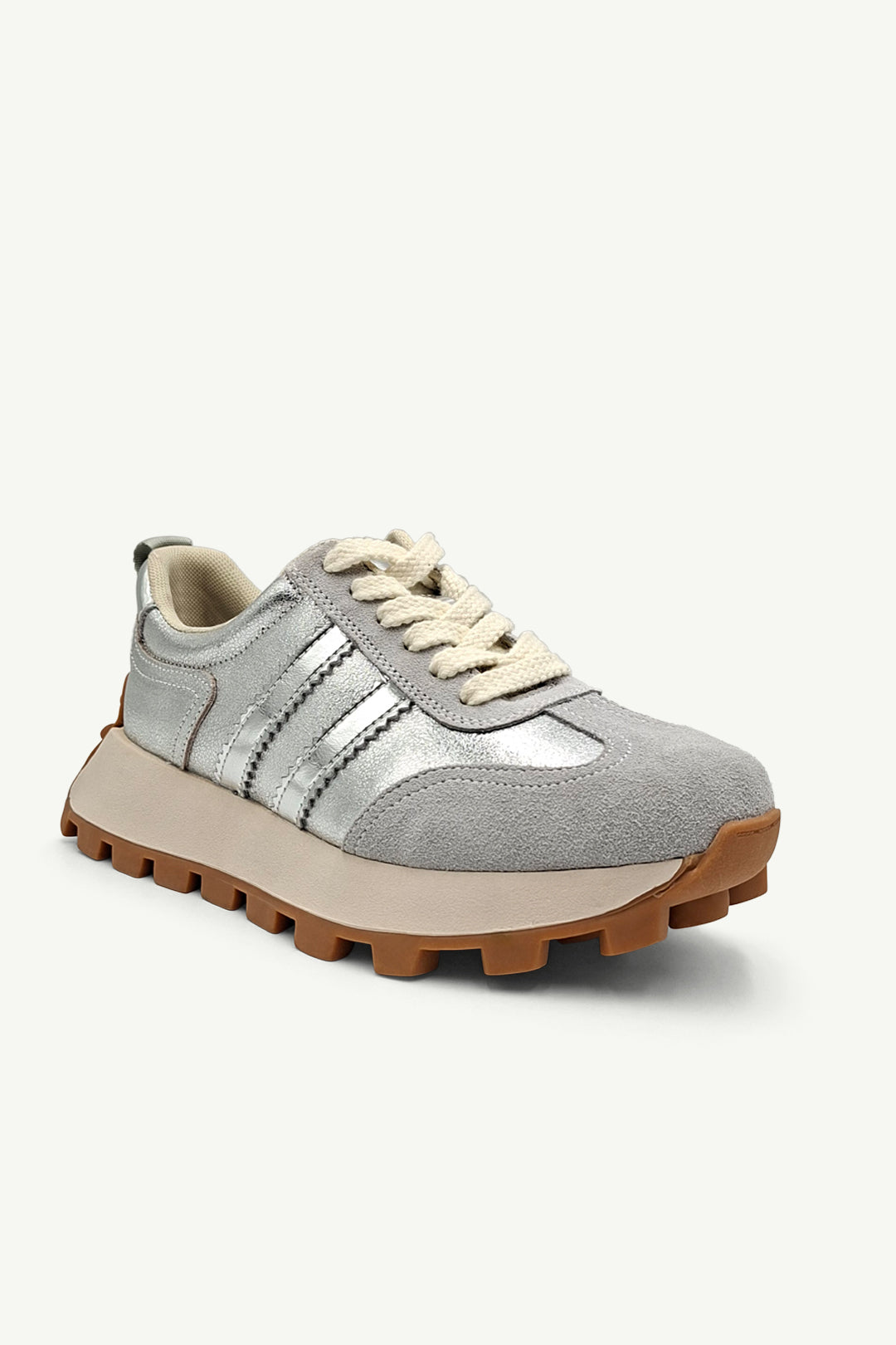 Meet Blaire, your go-anywhere sneaker with serious style mileage. This silver and grey update keeps things effortlessly luxe—soft suede uppers meet metallic silver stripes, while the chunky gum sole adds that perfect sporty edge. It’s your everyday trainer, elevated with a refined, modern finish.