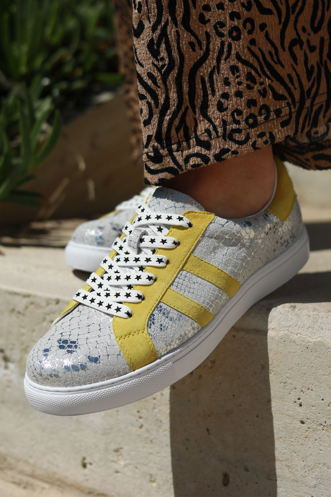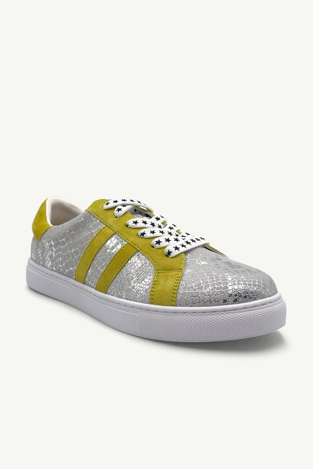 Malibu doesn’t follow trends — she makes them. With a crackled silver snake-print base and electric mustard-yellow suede trim, she’s equal parts glam and bold. The star-print laces add a playful twist, and we’ve even included a metallic silver lace option so you can switch up the vibe. Classic sneaker shape, wild personality.