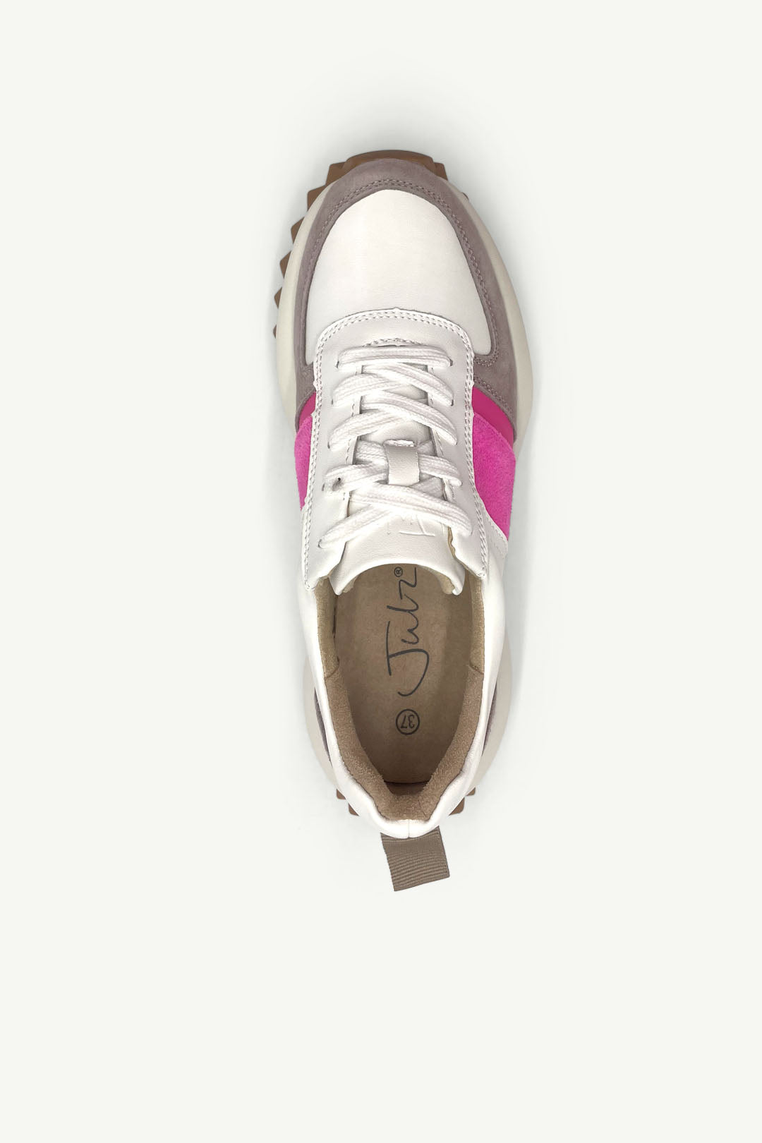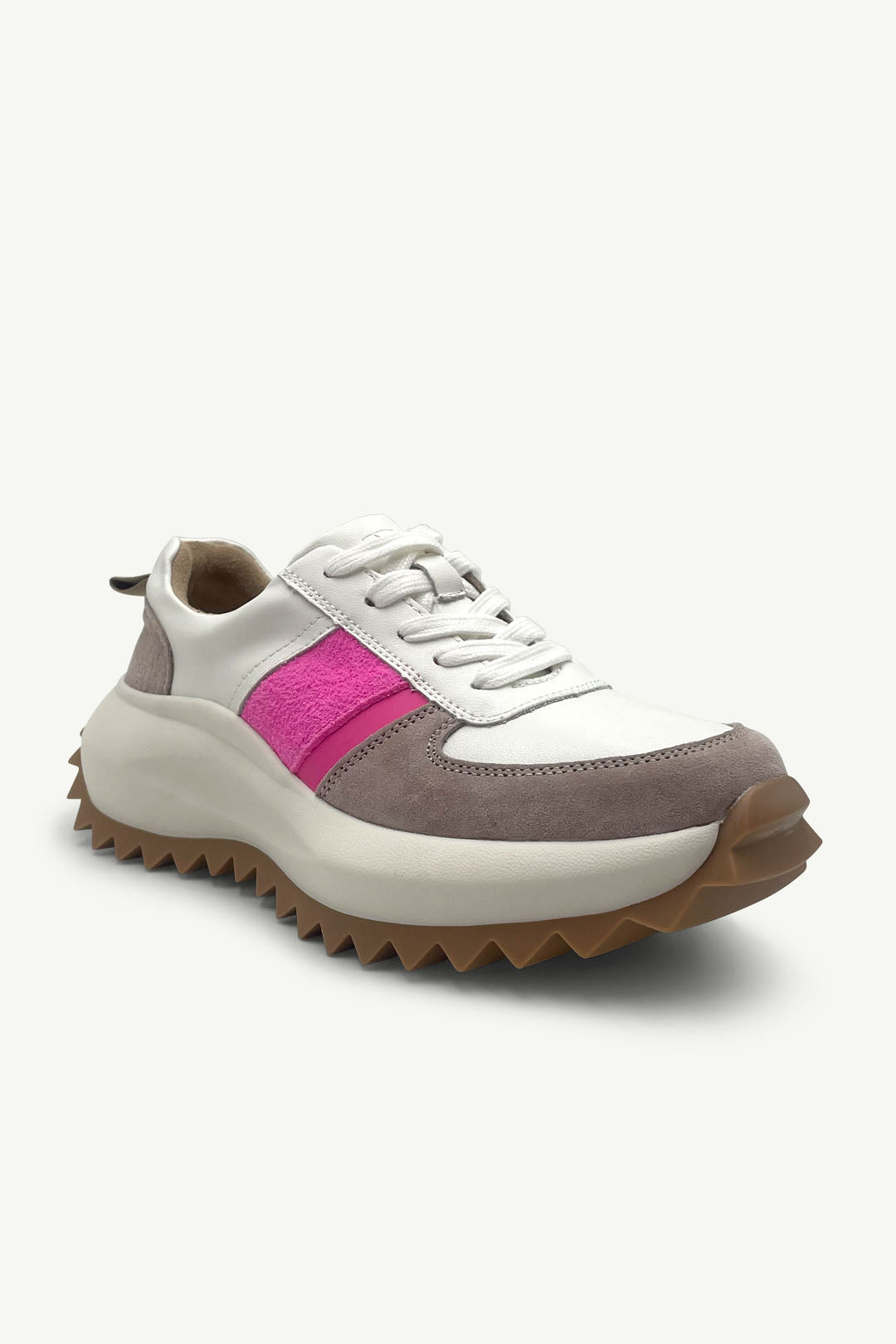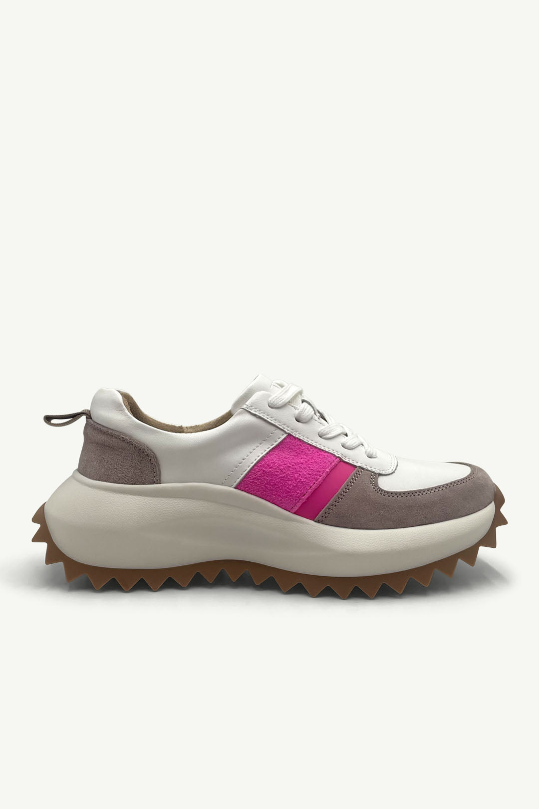 The Moon sneaker is a head-turner that blends sporty structure with playful colour. With crisp white panels, soft beige accents, and a bold pop of hot pink, it’s all about confident styling without sacrificing comfort. The sculpted ripple sole brings height, grip and major energy.