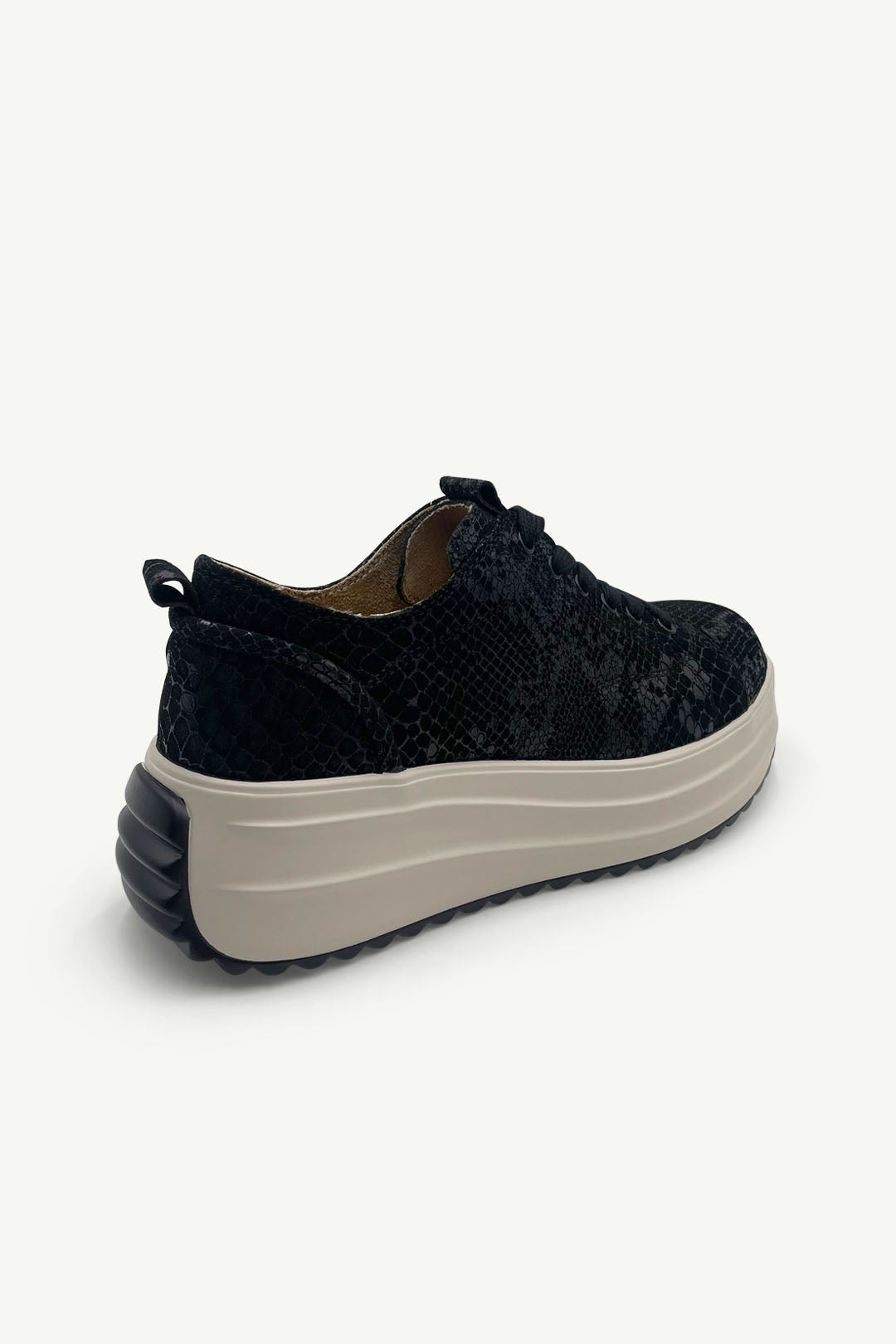 Raya is the elevated essential you didn’t know you needed. Crafted in luxe black snake-textured leather and set on a contrasting bone-toned platform sole, she adds height without the drama. The ripple tread keeps you grounded, while the all-black upper brings serious street-style edge. Whether you’re dressing up or keeping it casual, Raya gives your outfit an instant lift.