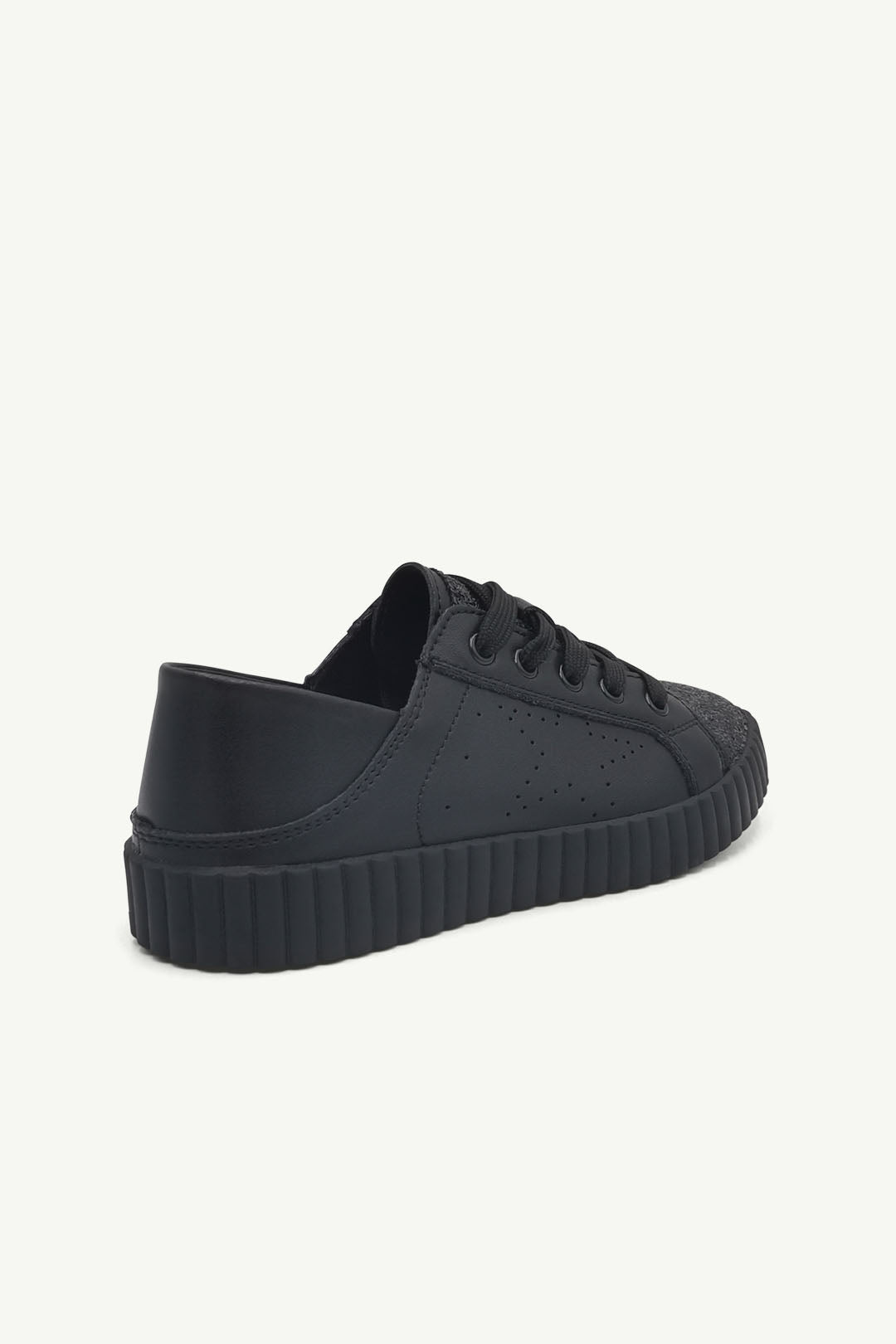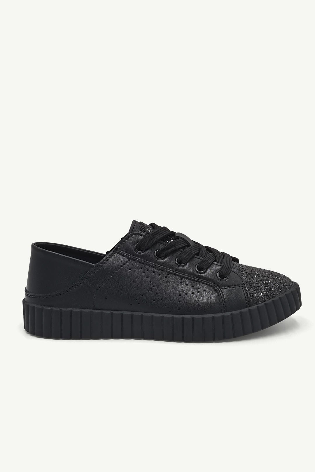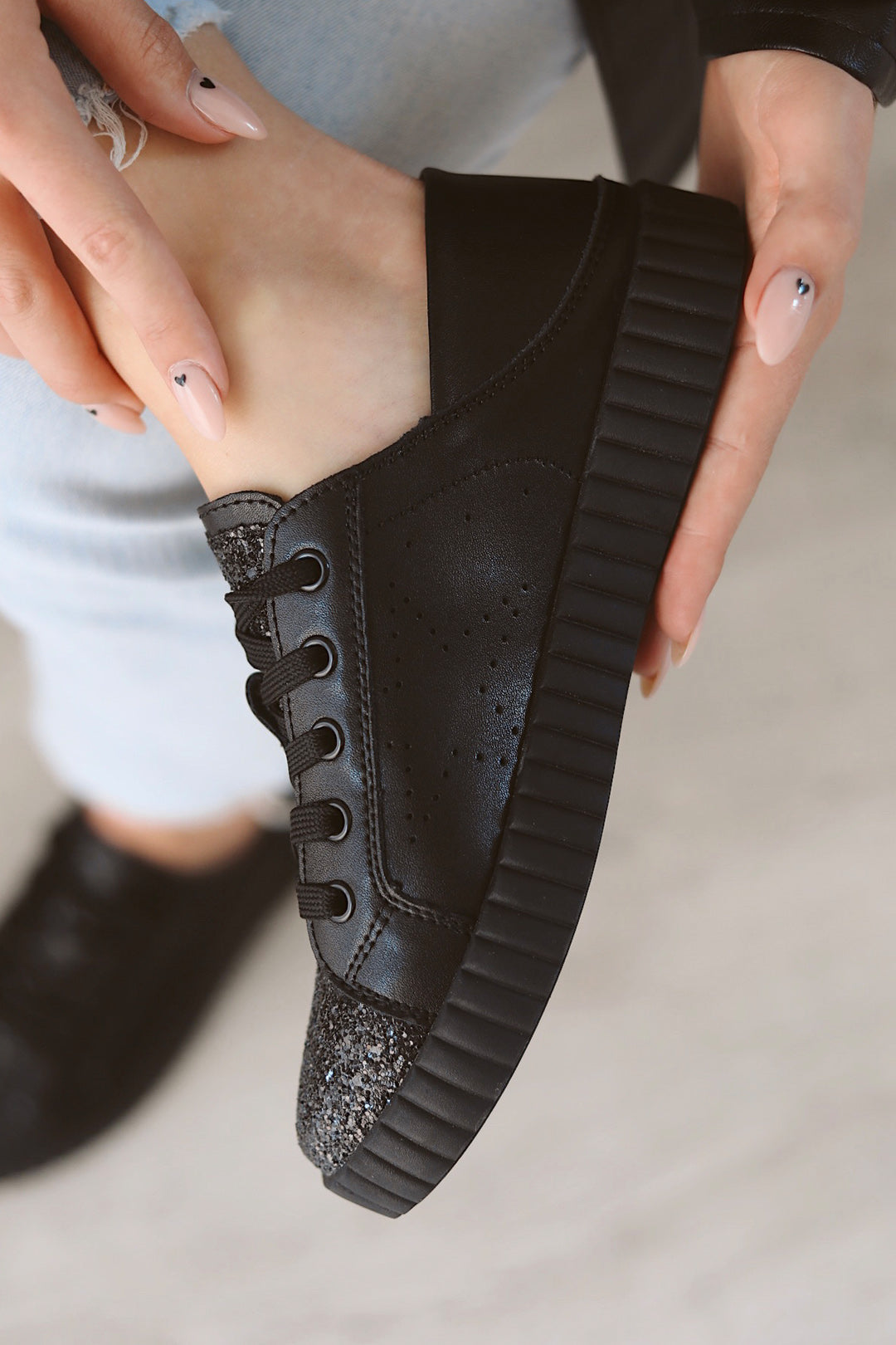 Valentina is your midnight essential — part mule, part sneaker, all attitude. This slip-on style keeps things fuss-free while serving up major glam with a glitter-dusted toe and tonal black finish. From airport runs to after-dark plans, she’s comfy, cool, and always a little extra (in the best way).