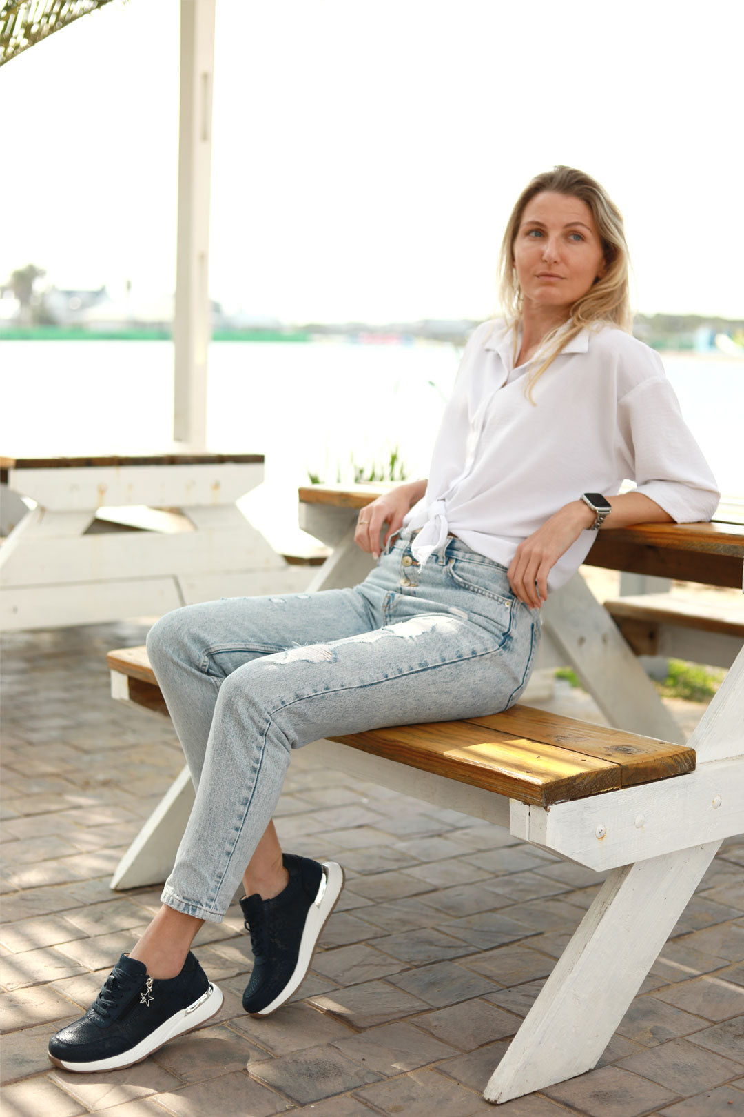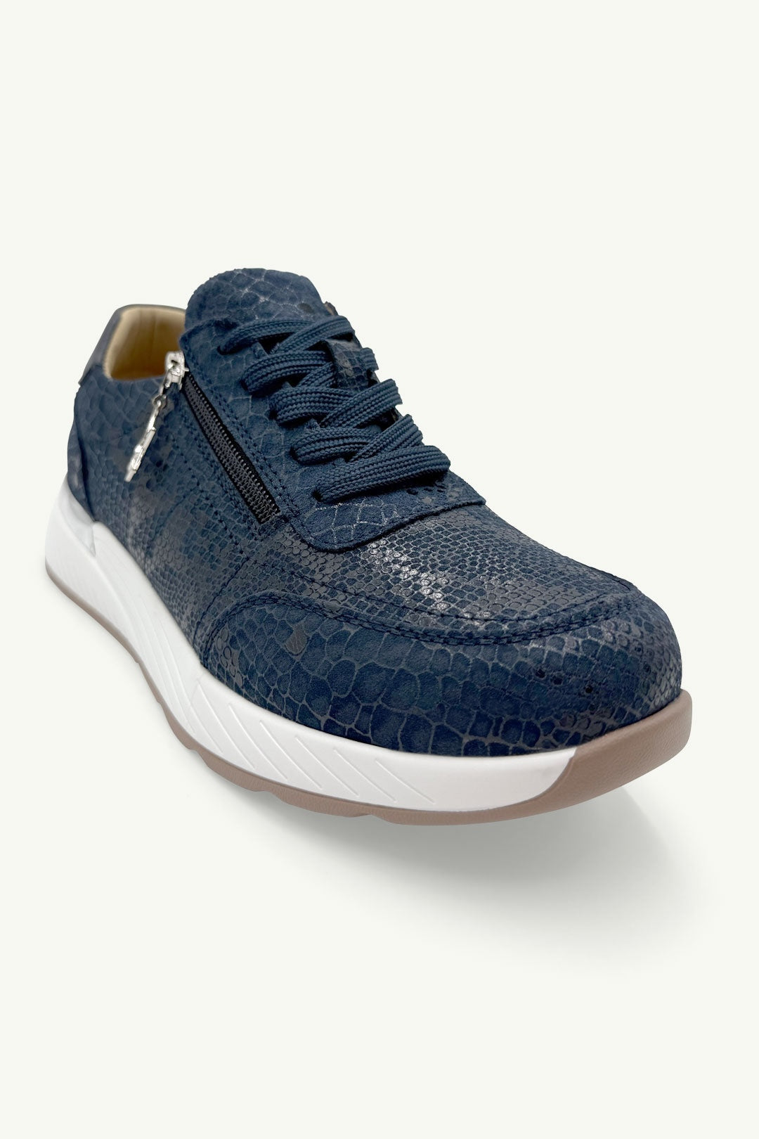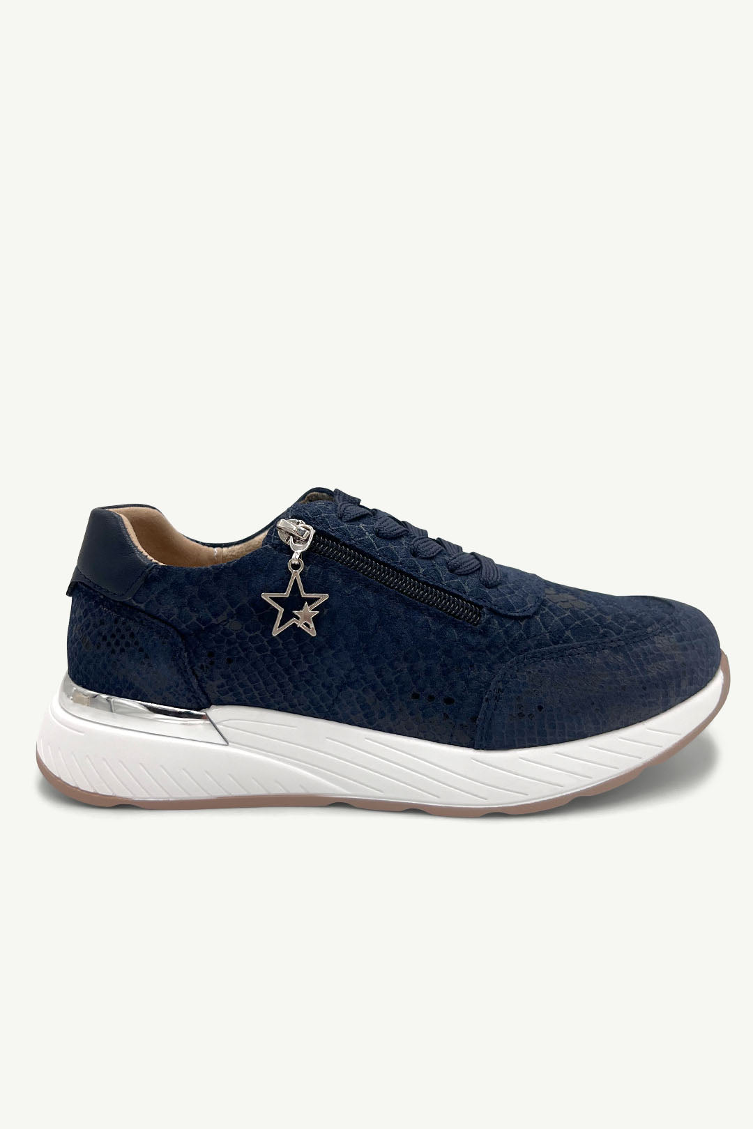 Chunky sneaker meets city glam in this navy number that turns heads without trying too hard. With its luxe snake-embossed finish, metallic charm detail, and pop of silver on the heel, the Nina is where comfort meets cool.