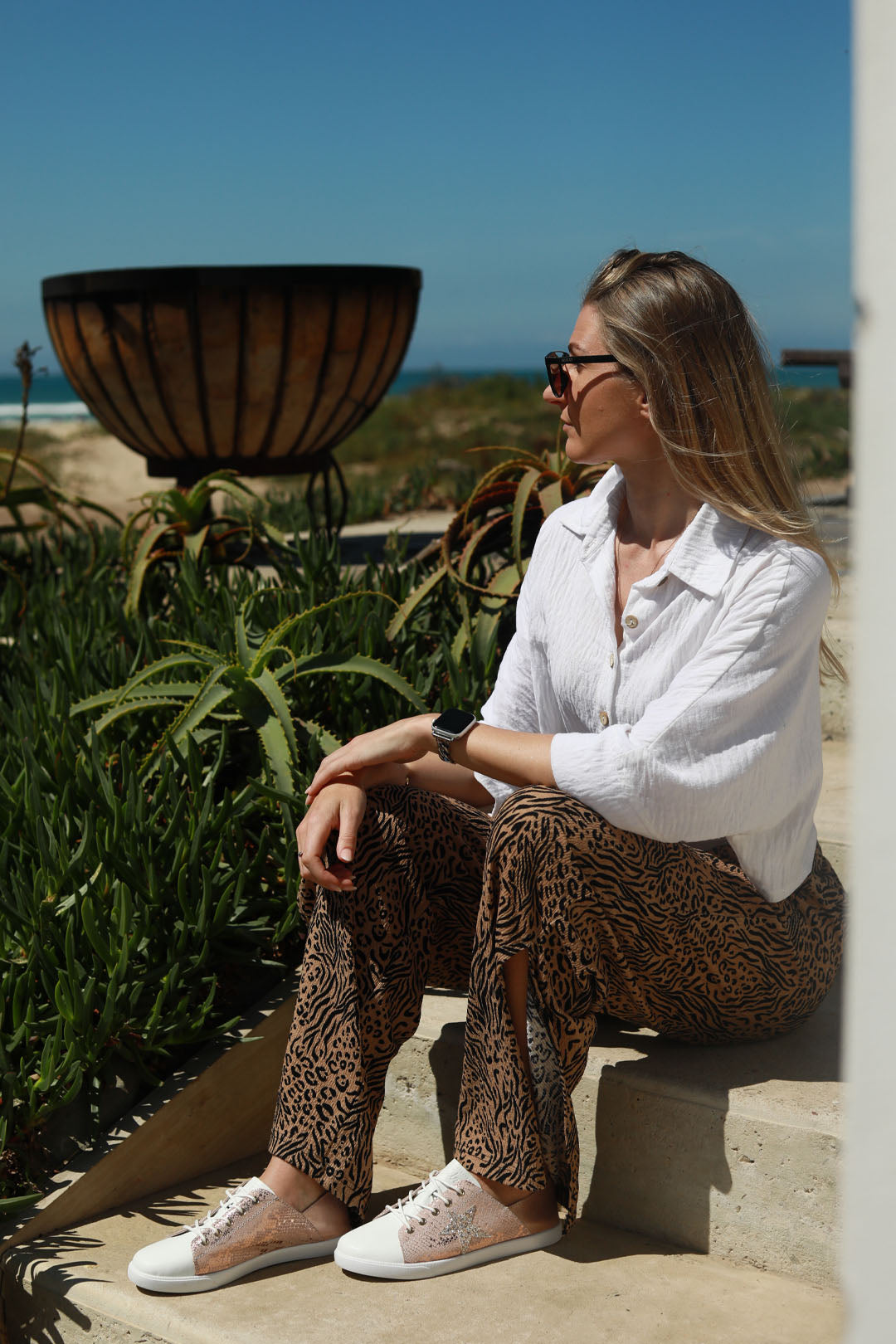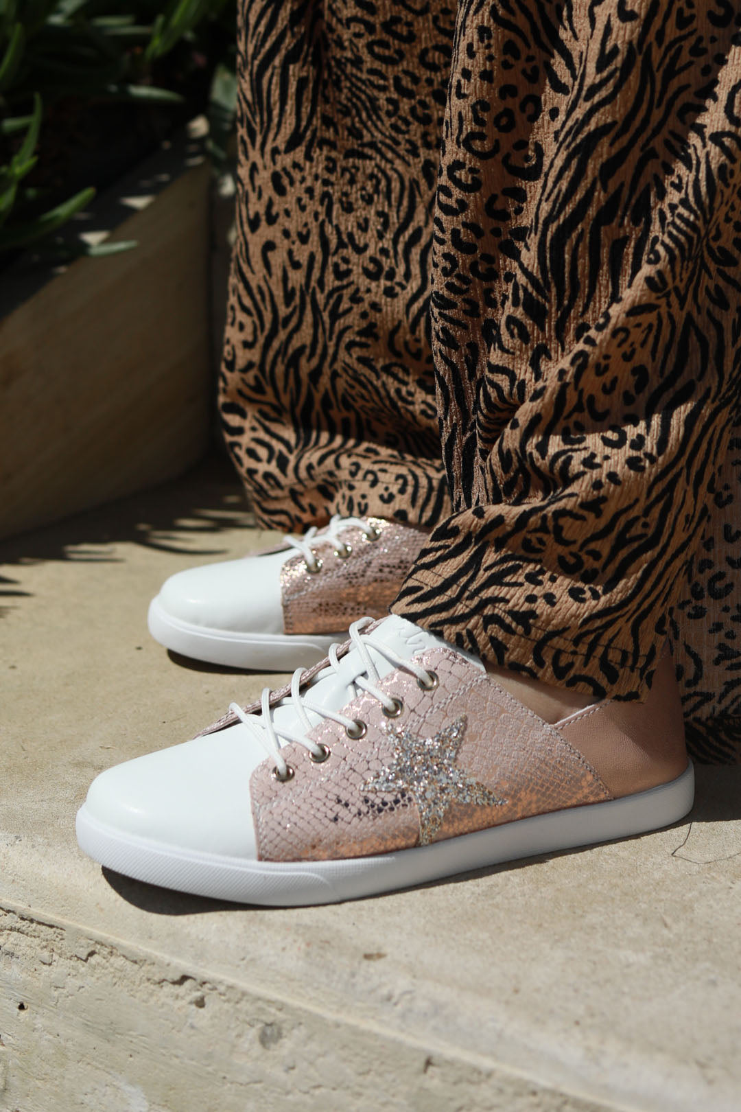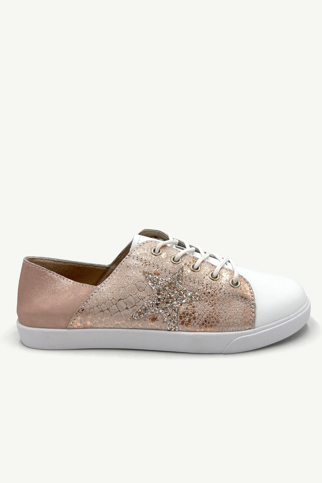 This one’s for the magpie girls. A crackled rose gold snakeskin panel, glitter star, and crisp white toe bring the drama and the ease. A bold sneaker that turns heads, and still slips on like a dream.