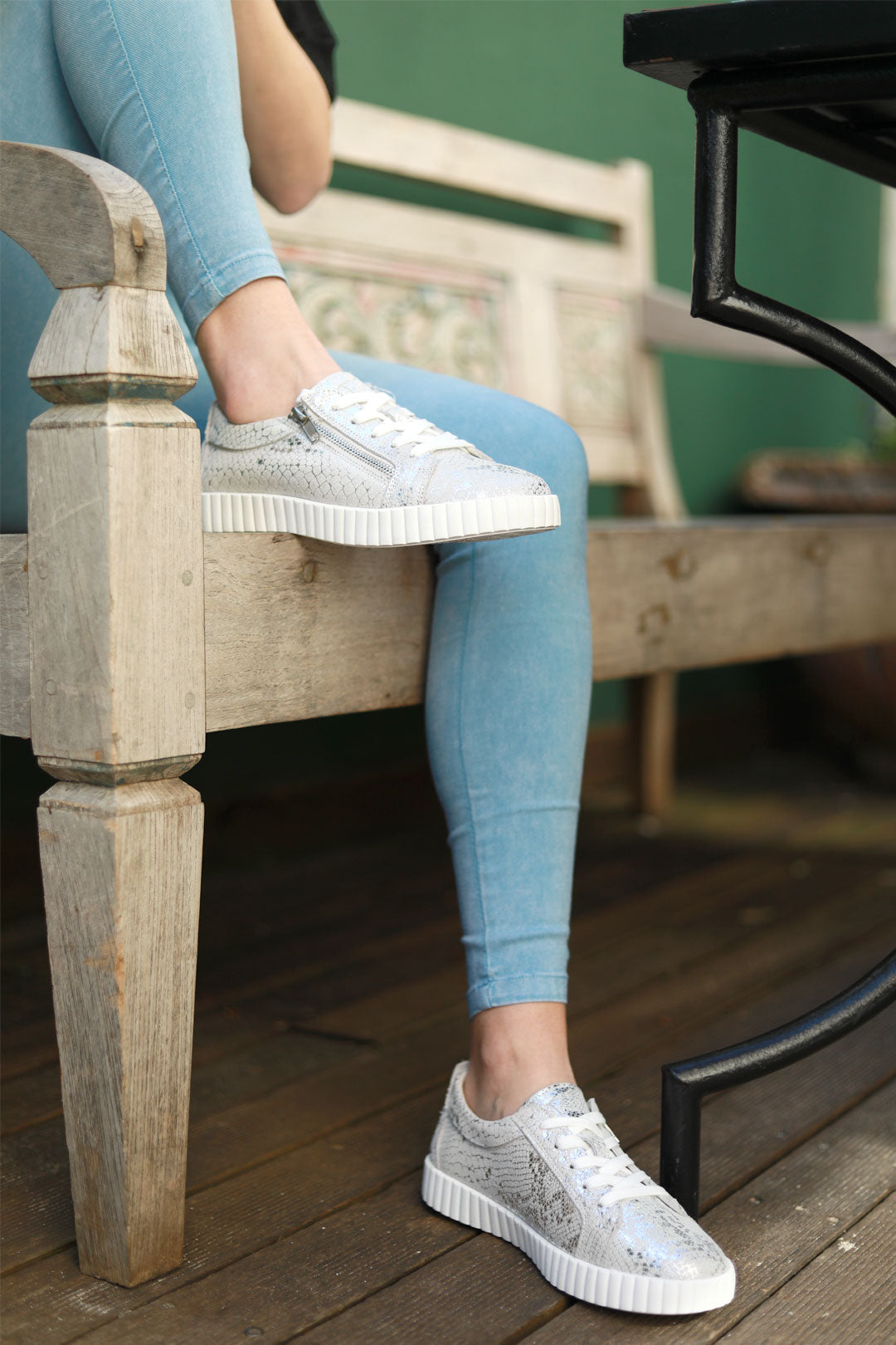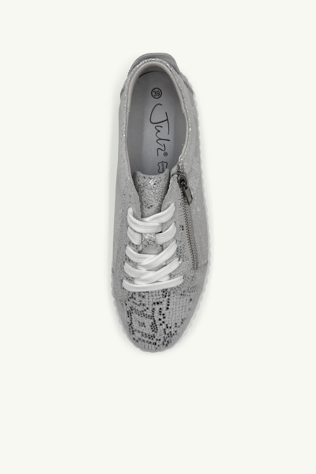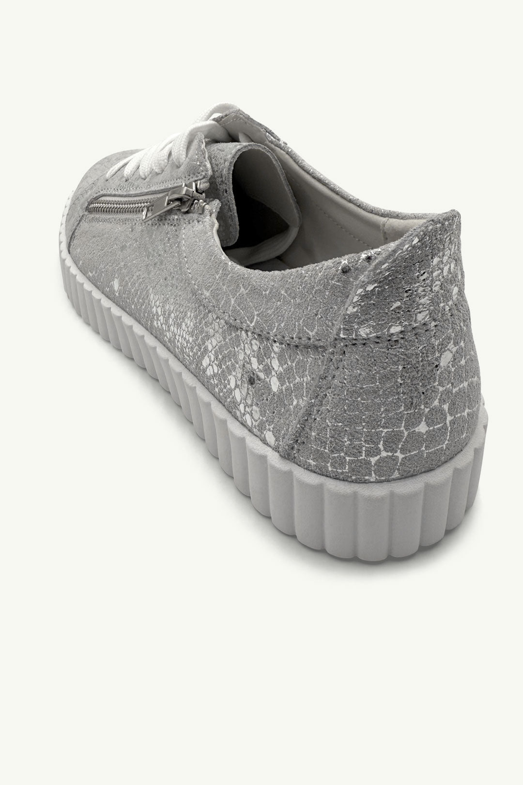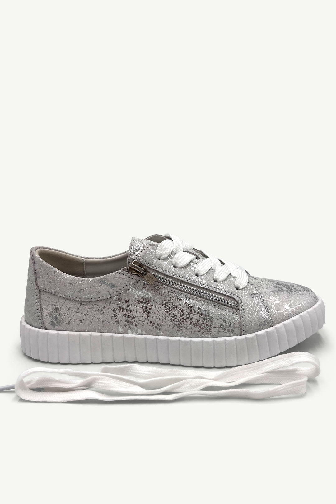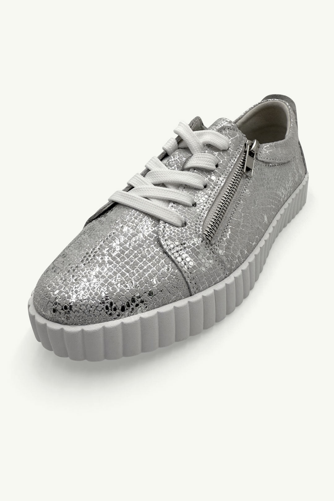 Turn your daily step count into a fashion statement with Callie in Silver Snake. This low-top leather sneaker brings a luxe twist to your casual wardrobe, thanks to its metallic snakeskin texture and chunky ribbed sole. Complete with laces and a side zip for easy on-off, it’s the kind of comfy-cool you’ll reach for every day.