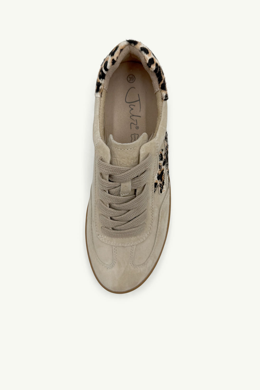 This is quiet luxury with a little bite. Earthy taupe suede meets bold leopard print for the kind of sneaker that blends in just enough — until you want it to stand out.