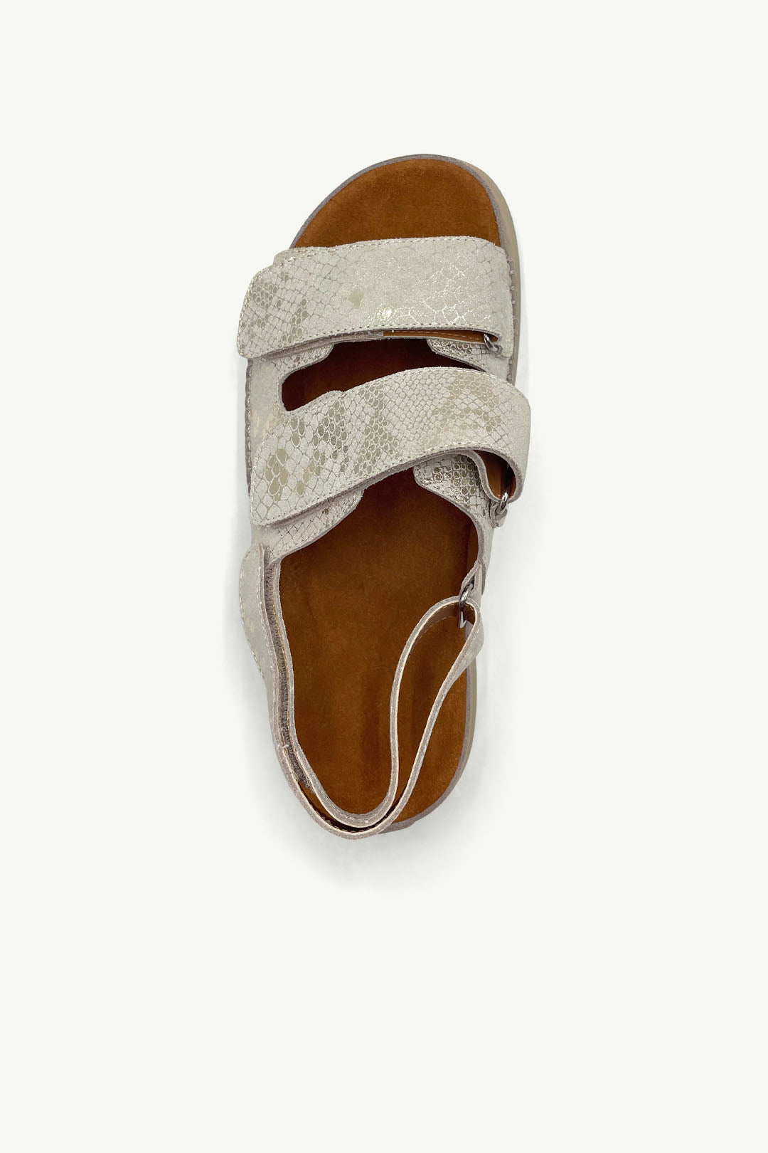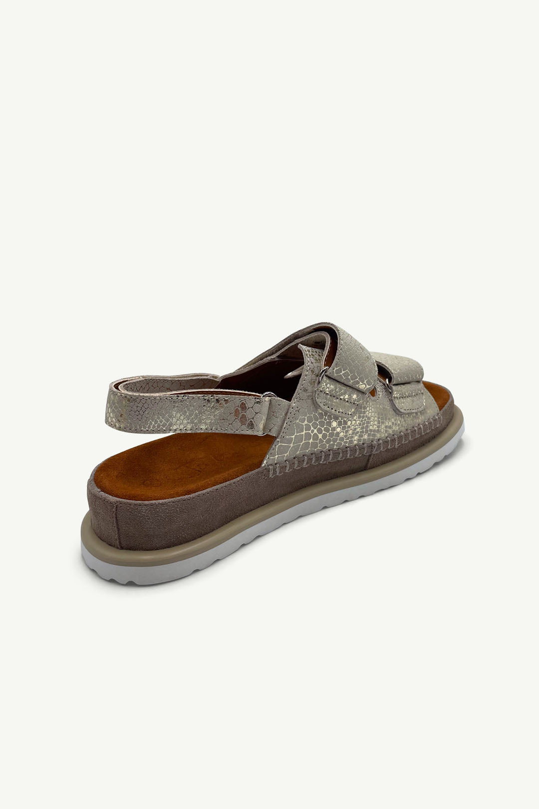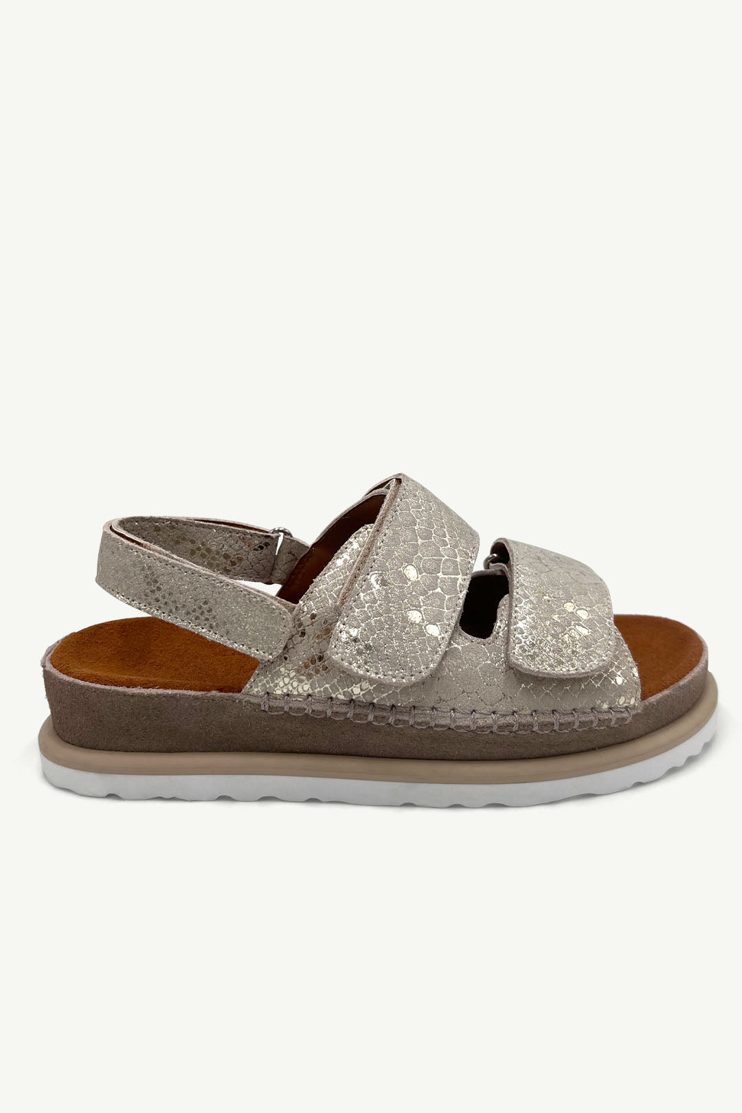 This double-strap sandal is decked out in soft gold snake-textured suede leather with a subtle shimmer that catches the light just right. Cushioned underfoot and velcro-fastened for the perfect fit, Rae is made for days on the move (or days that turn into nights).
