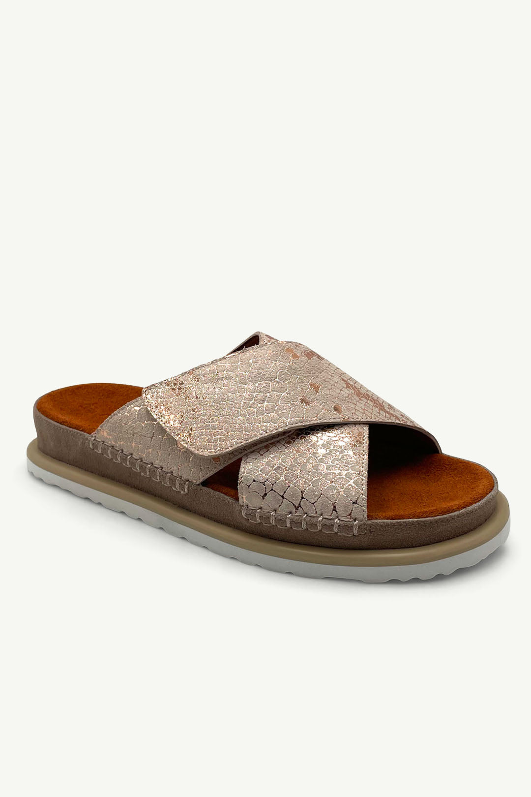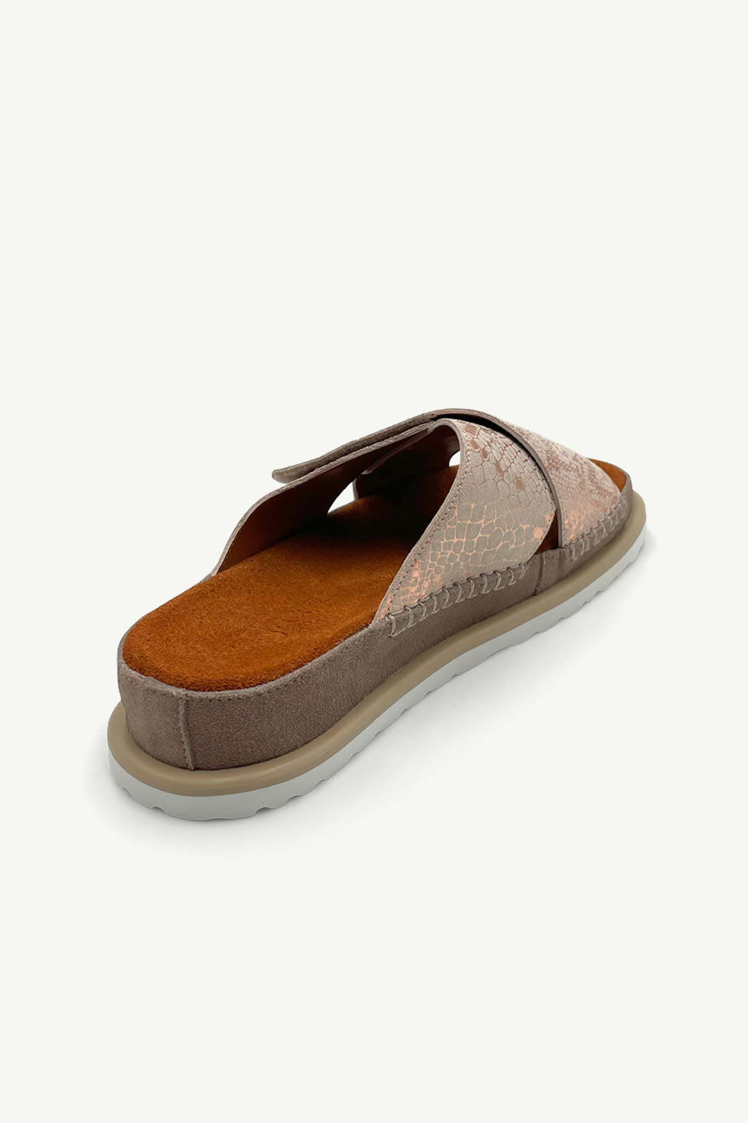 Glam meets everyday ease in the Reese Rose Gold Snake slide — your go-to for effortless style and cloud-like comfort. With its soft metallic sheen and tonal snake texture, this sandal balances subtle sparkle with serious support.