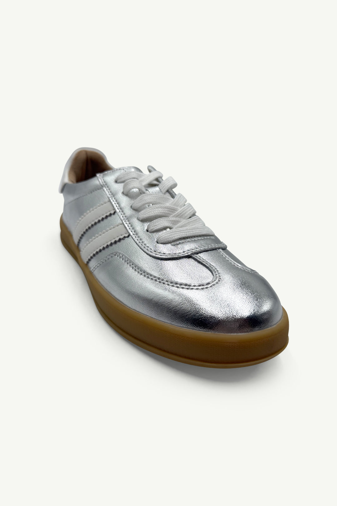Metallic Silver Leather Upper: High-shine, mirror-finish leather that catches the light (and compliments) from every angle, bold without being loud.