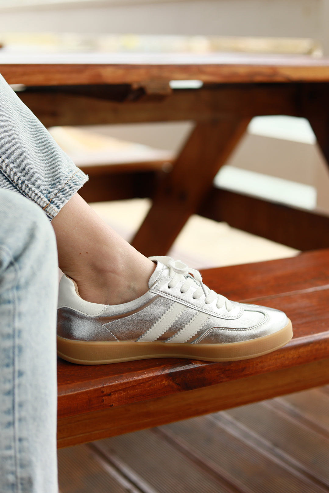 Retro Gum Sole: A nod to 70s track style, this warm tan rubber sole balances the cool chrome with everyday wearability.
