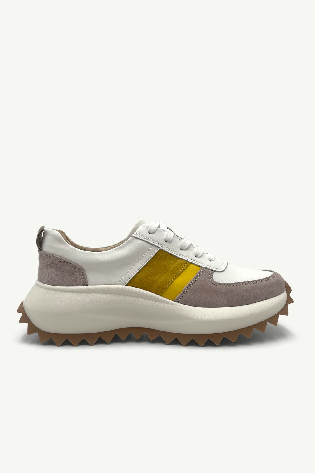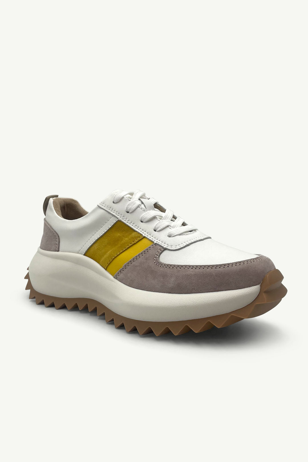 The Moon sneaker brings bold energy and a sunny twist to your off-duty style. With warm yellow accents layered over crisp white leather and soft taupe suede, it’s a standout look that’s still super wearable.