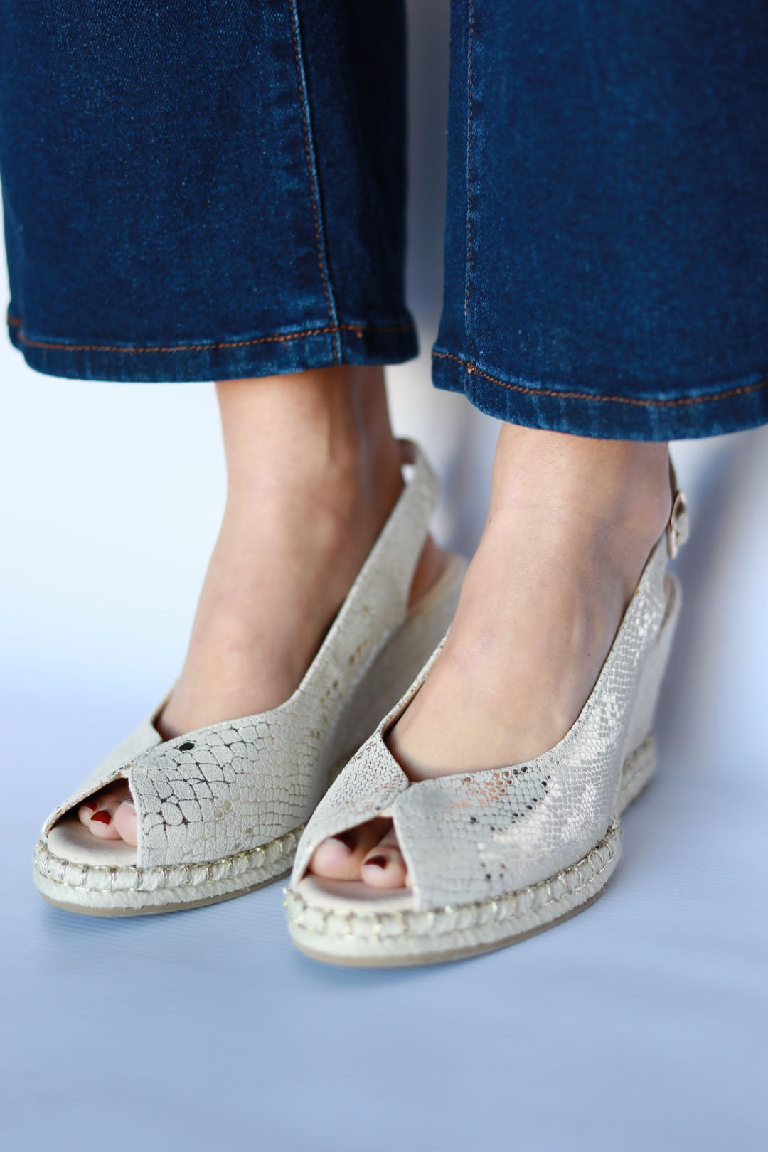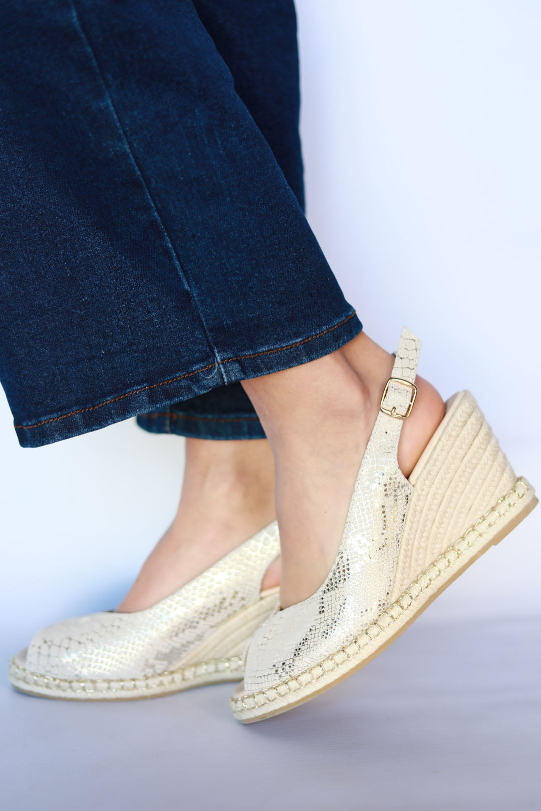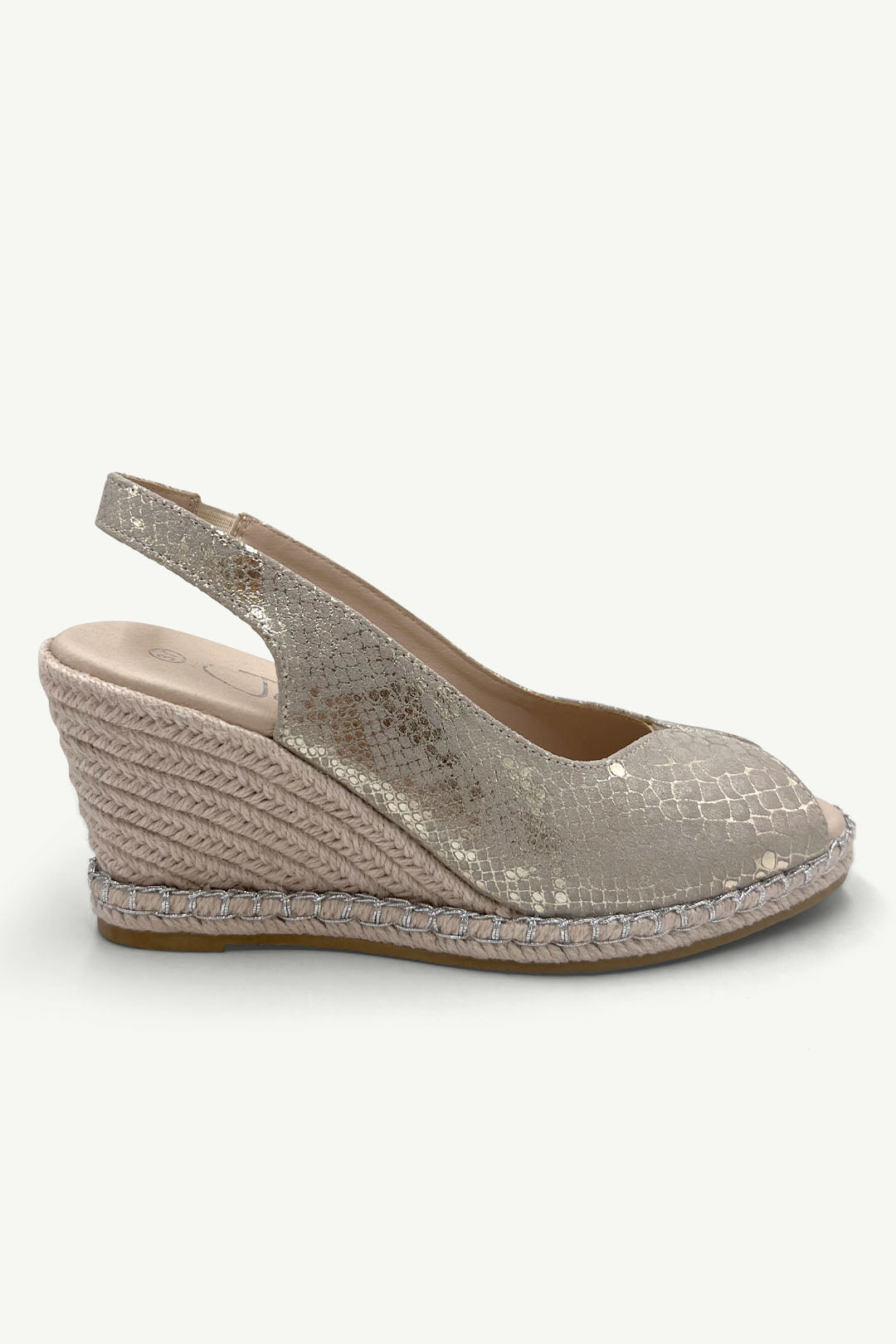 Step up your summer wardrobe with Raven Gold Snake — the perfect mix of comfort, height, and head-turning glam. This open-toe wedge brings a soft shimmer with its gold foil snake-textured upper, making it the ultimate day-to-night style for holidays, garden parties, and golden hour strolls.