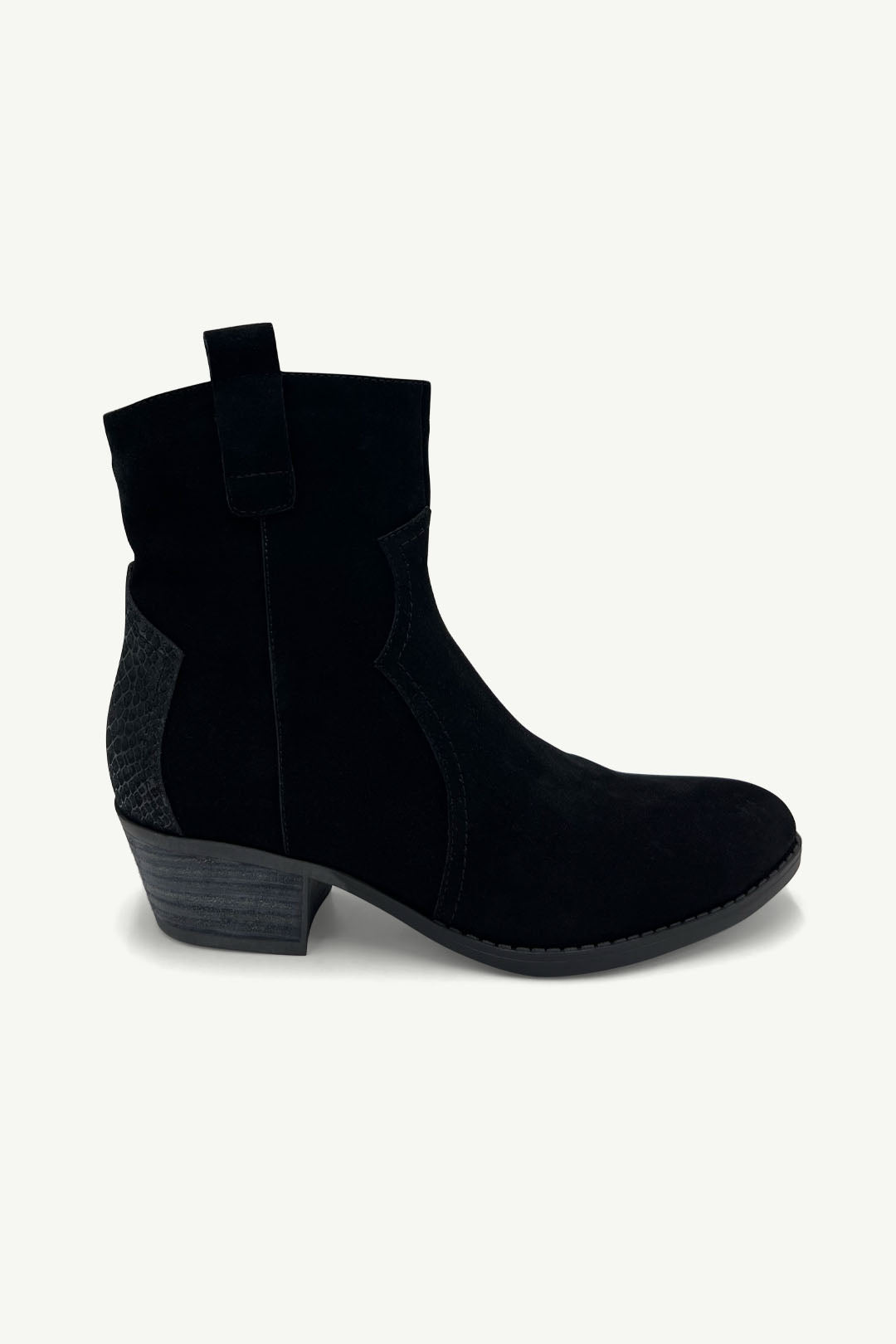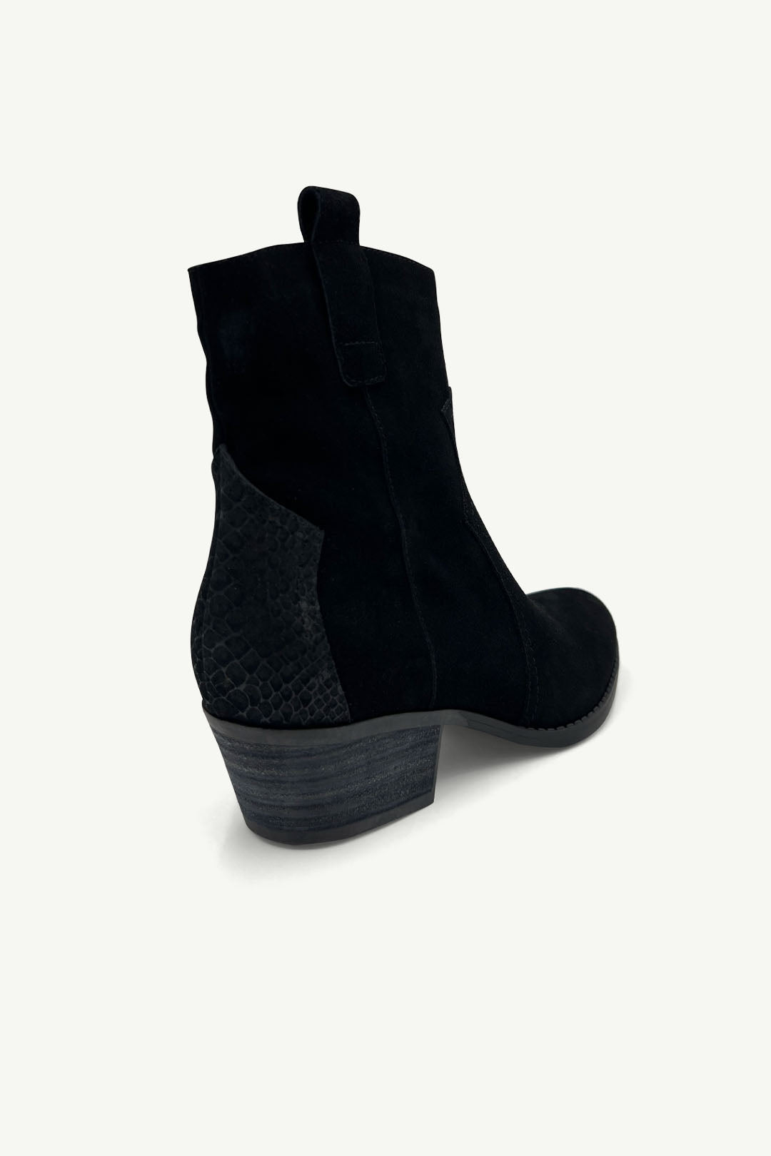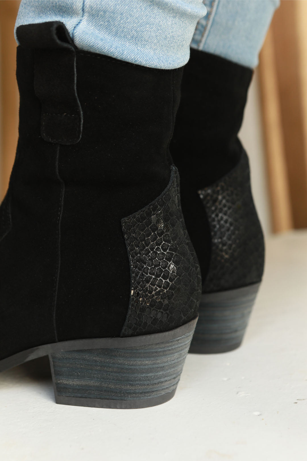 Subtle Texture, Strong Statement: Crafted in a rich black faux suede with a tonal snake-textured panel at the back, Belle offers just the right amount of contrast to elevate your winter looks.
