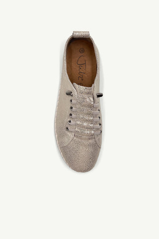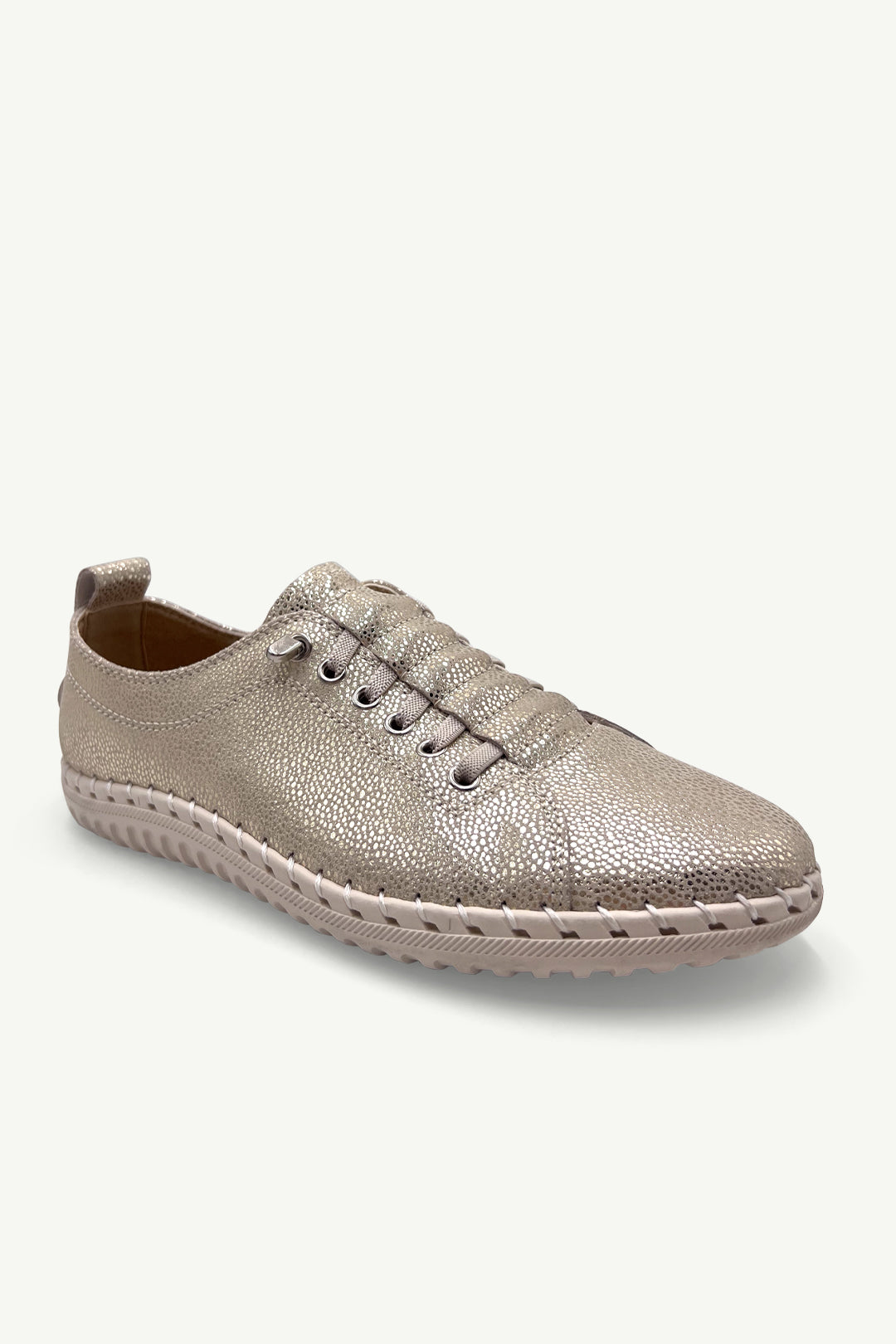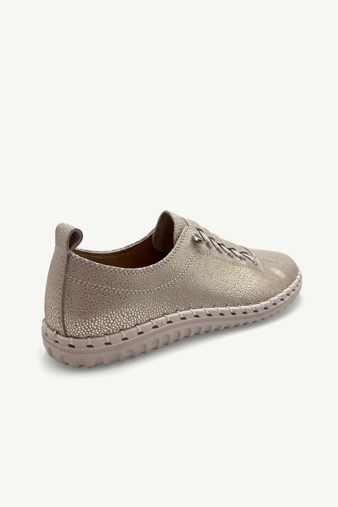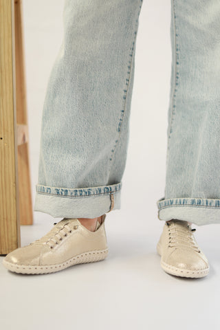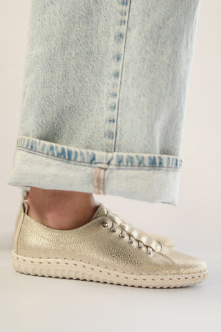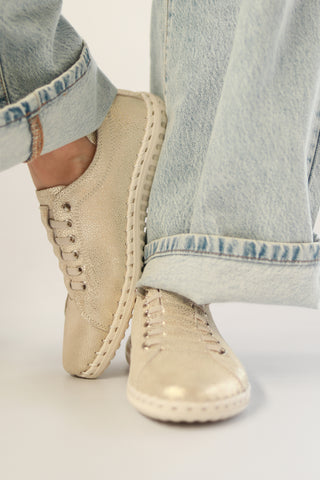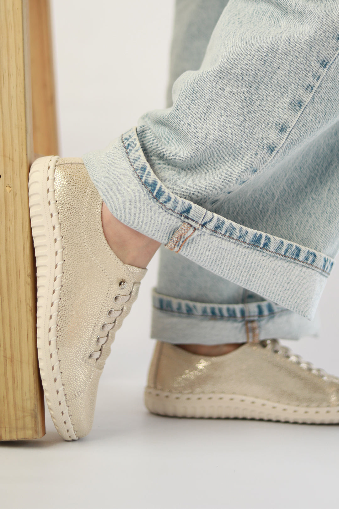 Effortless Glam, Everyday Comfort: The sneaker that brings a soft shimmer to your step. With its subtle metallic gold finish, Gina is the perfect blend of casual comfort and elevated style.