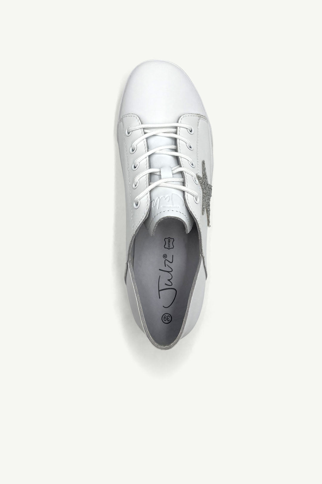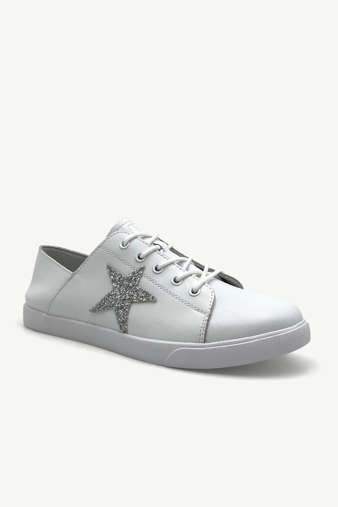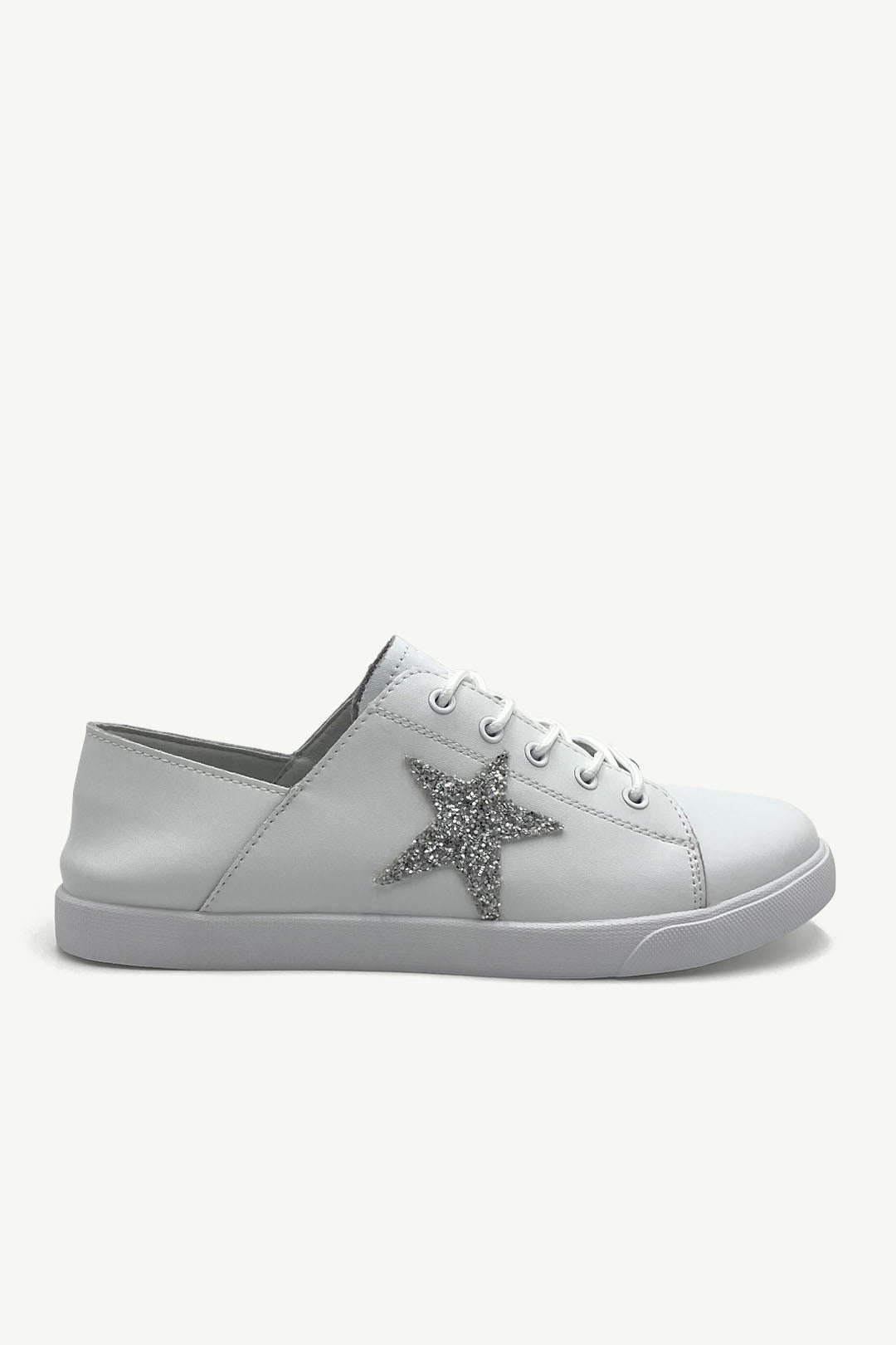 This is your everyday sneaker turned statement-maker. Clean white meets a bold silver glitter star, making this pair a blank canvas with attitude. Light, easy to wear, and impossible to miss.